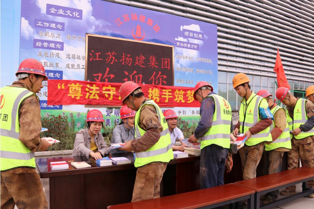 揚建網(wǎng)訊 為了讓農(nóng)民工能尊法守法,且能用法律武器維護自己的合法權益,市總工會開展了送法下工地活動 。28日下午,市總工會法工部郭永忠部長帶領揚州市總工會律師顧問一行4人,深入到我集團承建的揚州市大劇院項目部施工現(xiàn)場,開展“尊法守法·攜手筑夢”宣傳活動。