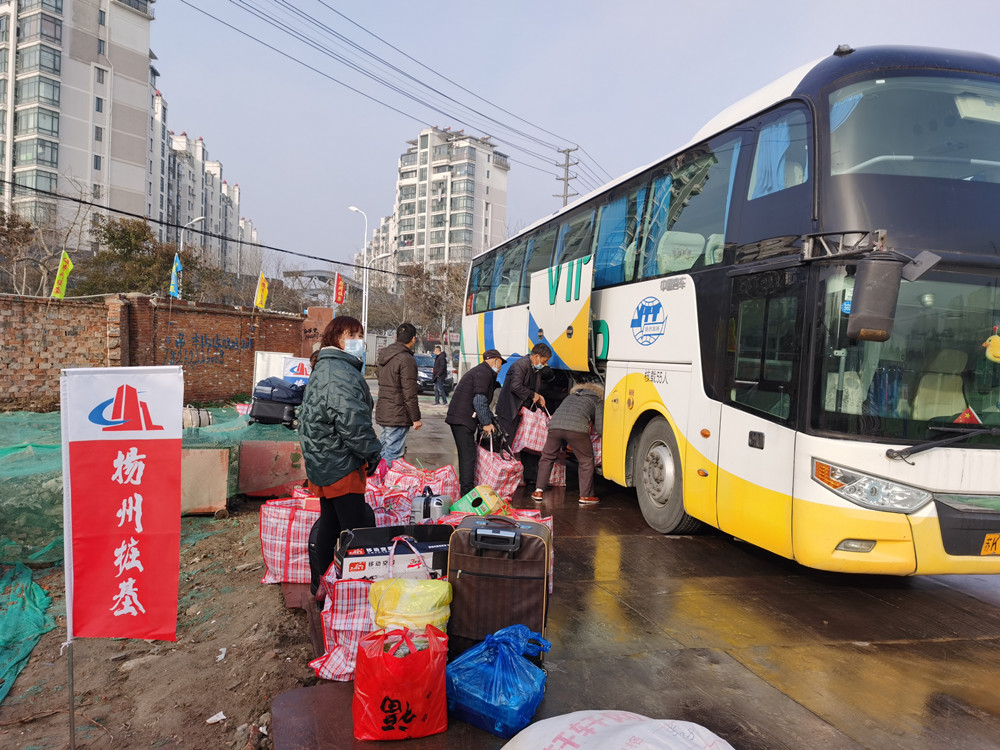 揚(yáng)建網(wǎng)訊 2月6日上午,樁基公司在210工地包車專程送25名農(nóng)民工返鄉(xiāng)過(guò)年。樁基工會(huì)主席蔣珍如、外埠管理公司負(fù)責(zé)人于冠云到場(chǎng)為大家送行。