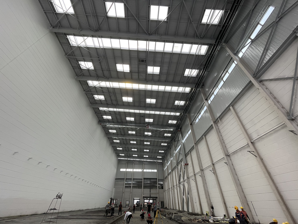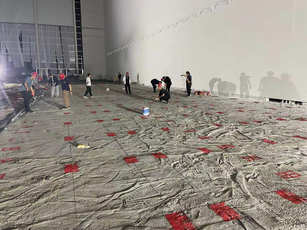 同時(shí)進(jìn)場(chǎng),分進(jìn)合擊。隔墻板安裝隊(duì)組、地坪隊(duì)組、油漆隊(duì)組等多家隊(duì)組同時(shí)入場(chǎng)施工,面對(duì)多隊(duì)組交叉作業(yè),項(xiàng)目部做好了充分的計(jì)劃安排及保障措施。4000多平方米、24米高的立面隔墻板安裝,兩家隊(duì)組從東西兩個(gè)方向同時(shí)安裝,30個(gè)工人,耗時(shí)140多小時(shí),安裝了2000多塊隔墻板。過程中,安裝隊(duì)組攻克了預(yù)制的ALC墻板訂貨周期長(zhǎng)、工人在夏季長(zhǎng)時(shí)間高空作業(yè)等各種困難。油漆隊(duì)組緊跟安裝隊(duì)組,隔墻板裝好一個(gè)工作面就緊跟另一個(gè)工作面。墊層、防潮膜、保護(hù)層、放線、扎鋼筋、鐵件預(yù)埋、關(guān)模、澆筑地坪……在有限的時(shí)間里道道工序,層層把關(guān),都有條不紊地順利完成。