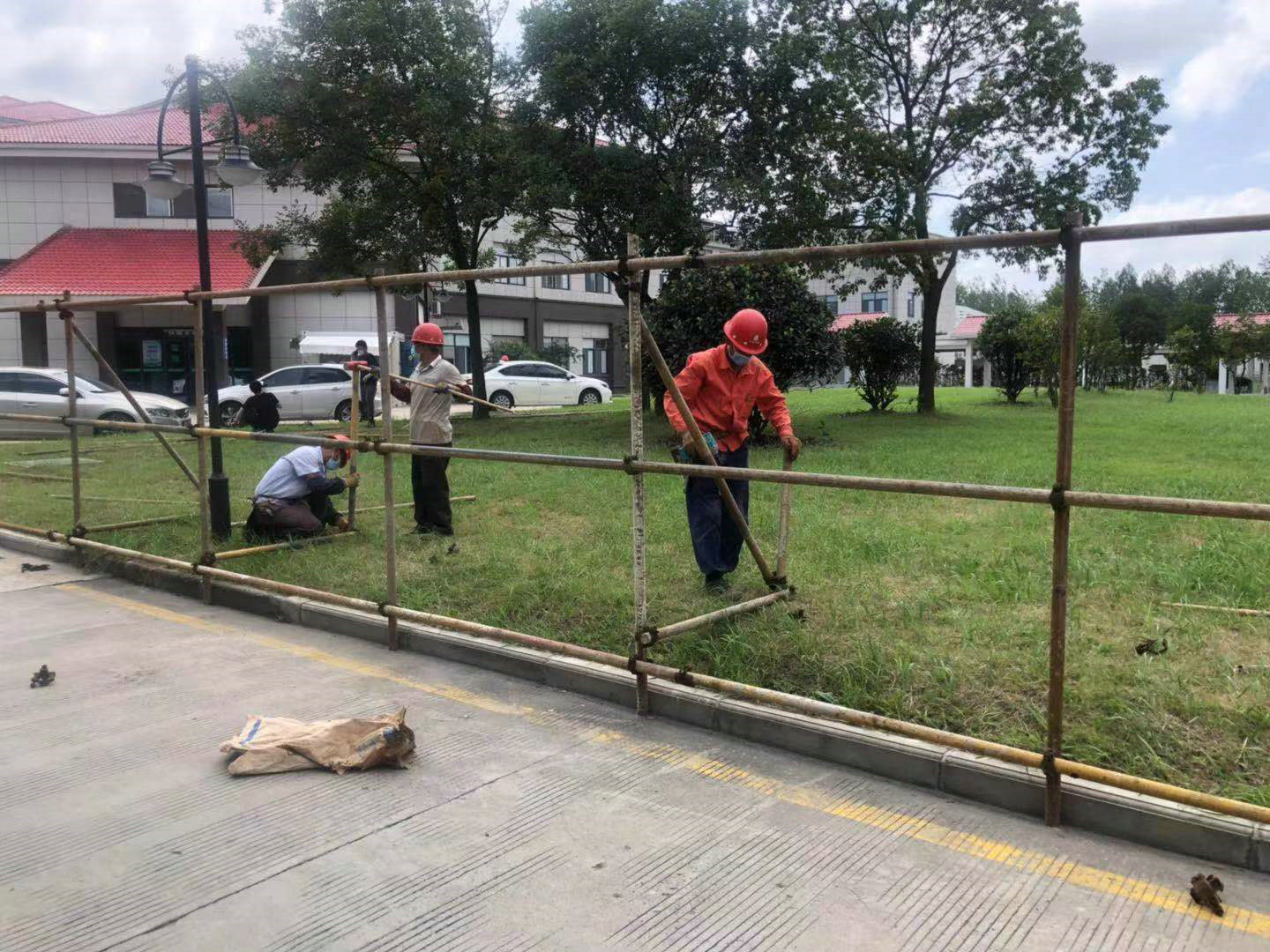 8月3日早7點,以二公司項目經(jīng)理楊明珍為首的12名管理人員到達現(xiàn)場,積極備戰(zhàn)工程施工。由于疫情期間,材料的調配、人員的調動受到極大的阻礙。項目部得到集團領導及建設單位的大力支持。當天上午9點左右,現(xiàn)場材料及人員已經(jīng)陸續(xù)進場;中午11時左右,經(jīng)多方協(xié)調商議決定現(xiàn)場圍擋布置圖,項目部立即組織人員開始施工。施工過程中,二公司項目部共計調動93名施工人員,合理安排施工工序,多施工段同時施工,最大可能提高施工進度。主要工作內容包括鋼管運輸、人工錘擊埋置鋼管、圍擋鋼管連接與架設、螺栓預埋、固定彩鋼瓦、蒙擋綠草皮等。根據(jù)項目預計,全長約400米的室外圍擋的搭設、固定及彩鋼瓦、草皮的蒙擋,在當晚12點前全部完成,總施工時間不超過12小時。