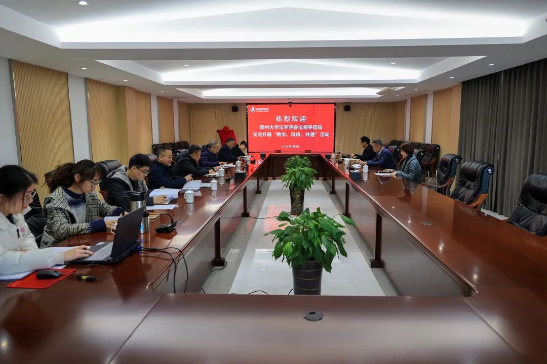 活動(dòng)過程中,雙方在B座二樓會(huì)議室進(jìn)行了廣泛、深入的交流座談,并舉行了揚(yáng)州大學(xué)法學(xué)院“教學(xué)科研實(shí)踐基地”共建協(xié)議簽約儀式,和揚(yáng)州大學(xué)法學(xué)院“教學(xué)實(shí)習(xí)基地”合作共建揭牌儀式。