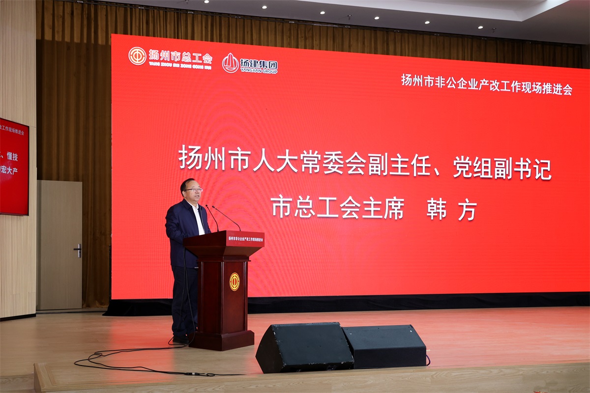 韓方在作總結(jié)講話時指出,召開推進(jìn)會旨在進(jìn)一步落實(shí)習(xí)近平總書記在同中華全國總工會新一屆領(lǐng)導(dǎo)班子成員集體談話時的重要講話精神以及中國工會十八大精神,促進(jìn)全市非公企業(yè)產(chǎn)改工作擴(kuò)面提質(zhì)增效。他高度評價了揚(yáng)建集團(tuán)產(chǎn)改工作所起到的示范引領(lǐng)作用,對全市非公企業(yè)產(chǎn)改工作提出三點(diǎn)要求:一是提高站位,充分認(rèn)識推動非公企業(yè)產(chǎn)改工作的重要意義。二是聚焦重點(diǎn),以更大力度推動非公企業(yè)產(chǎn)改工作取得實(shí)效。三是統(tǒng)籌資源,凝聚推進(jìn)非公企業(yè)產(chǎn)改工作合力。在市委市政府的堅(jiān)強(qiáng)領(lǐng)導(dǎo)下,守正創(chuàng)新、發(fā)力奮進(jìn),實(shí)干爭先、團(tuán)結(jié)奮斗,鍥而不舍推進(jìn)全市非公企業(yè)產(chǎn)改工作取得新突破、結(jié)出新碩果,為全面推進(jìn)中國式現(xiàn)代化揚(yáng)州新實(shí)踐做出更大貢獻(xiàn)。